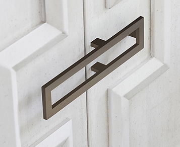 To complete this casually elegant ensemble, a spacious buffet features geometric molding and rectangular pulls in White Bronze.