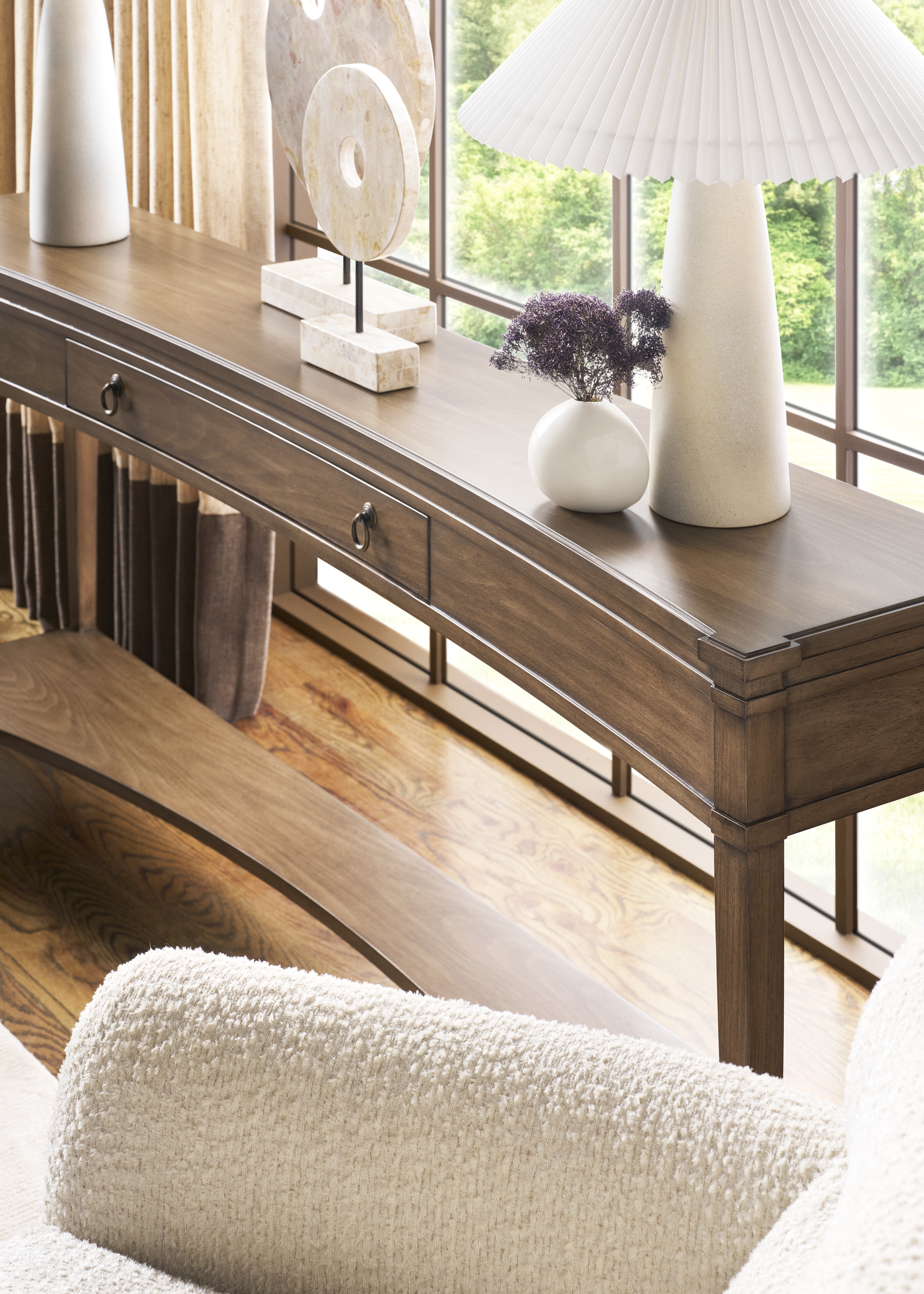 Cyprus Console (Compendium). Finish: Flaxen Stone. White Cedar Solids and Veneers, One Shelf, One Drawer, Lacquered Brass Hardware.