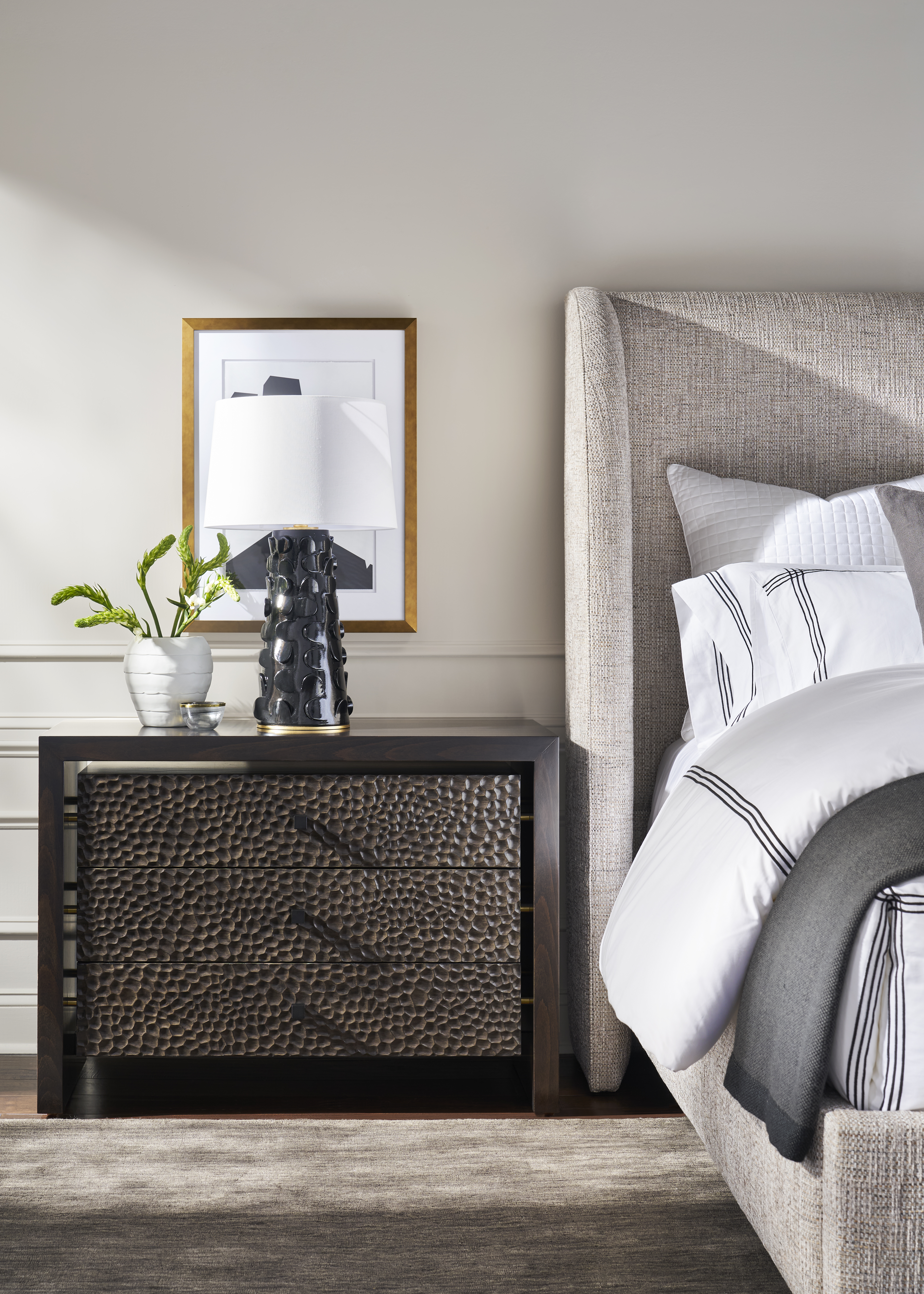 Fabric: Typical Desert Sand. Finish: Amarone. Maple Block Legs. CC243 Devon Large Three Drawer Nightstand (Make It Yours Bedroom). Finish: Amarone.