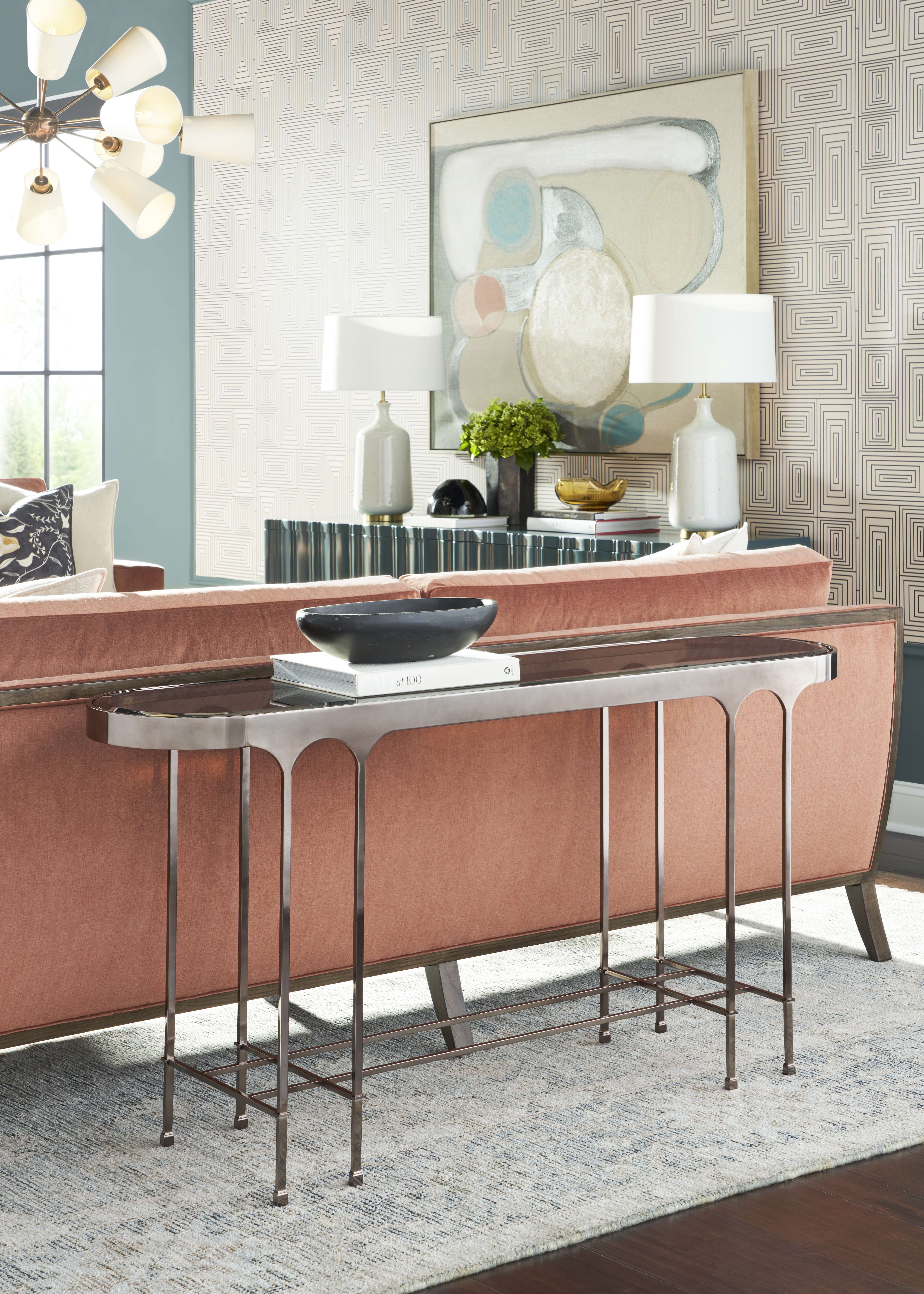 7007S Calliope Stocked Console (Perspective). Polished Cocoa Metal Base, Bronze Tinted Glass Top. 7015H Jazz Chests (Perspective) (2). Finish: Make It Yours Paint, Pristine Gloss in Benjamin Moore 2136-30 Amazon Green. One Adjustable Shelf Behind Doors, Two Doors with Touch Latches. V356-2S Knole Sofas (2) Fabric: Vello Canyon; two standard 21" throw pillows (square corner lipstitch) in Laurel Ebony. Finish: Flaxen Stone. Shown with two extra* MP134 pillows in Jagger Linen. *Optional charges may apply.