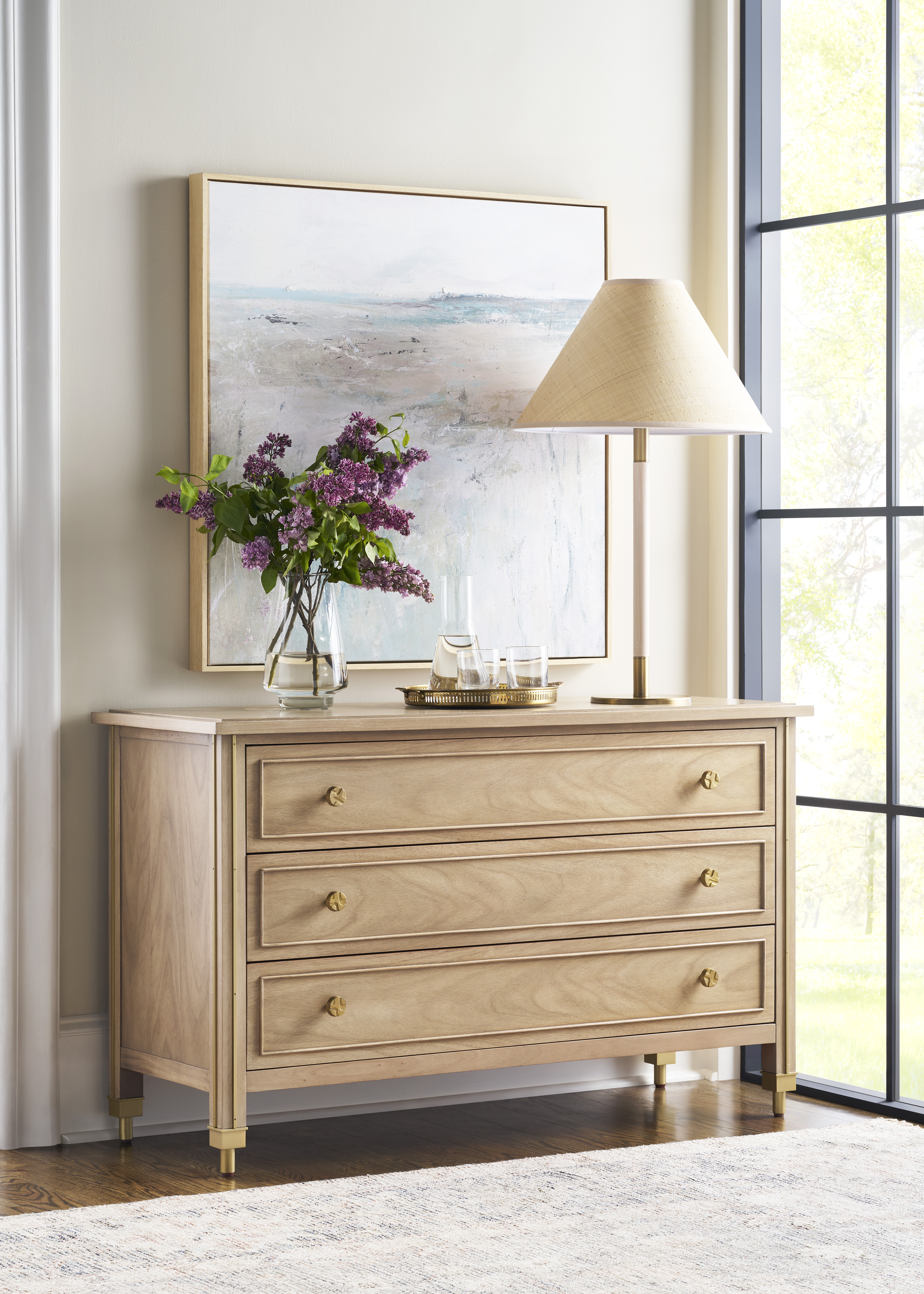 Reflection Chest. Finish: Almond. Bleached Flat Cut Mahogany Veneers and Solids, Three Drawers, Lacquered Brass Hardware, Metal Accents and Ferrules.