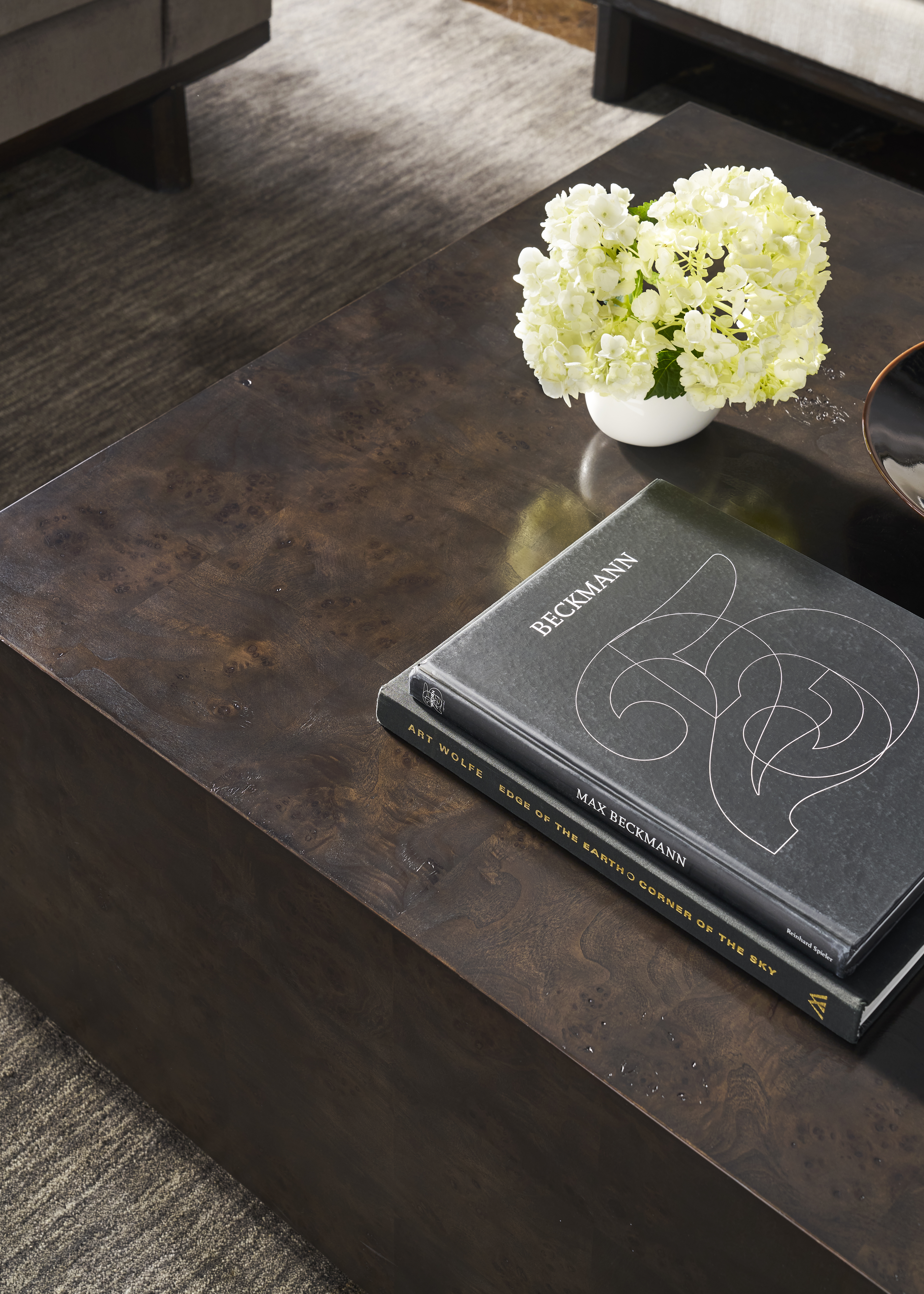 Verona Cocktail Table. Finish: Silver Briar. Random Match Mappa Burl Veneers on Top and Sides, Black Painted Base.