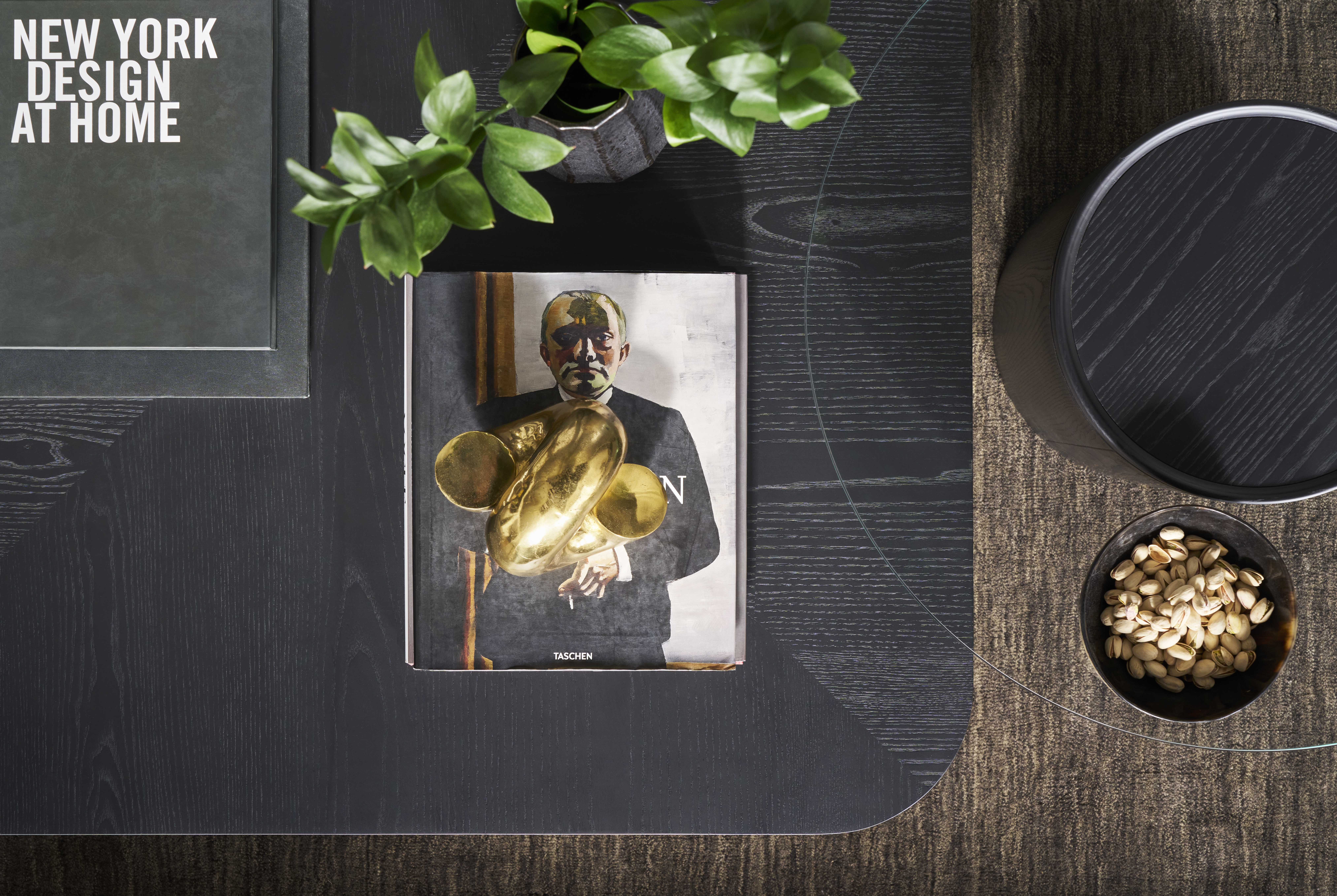 P744CS-FM Brixley Cocktail Table (Stocked). Finish: Film Noir. Ash Solids and Veneers, Ash Veneer in Diamond Pattern on Square Top, Clover Shaped Three-Sided Base. P744E-FM Brixley End Table (stocked). Finish: Film Noir. Ash Solids and Veneers, One Small Wooden Tray in Center on Top, Clear Tempered Glass Top with Polished and Eased Edges.